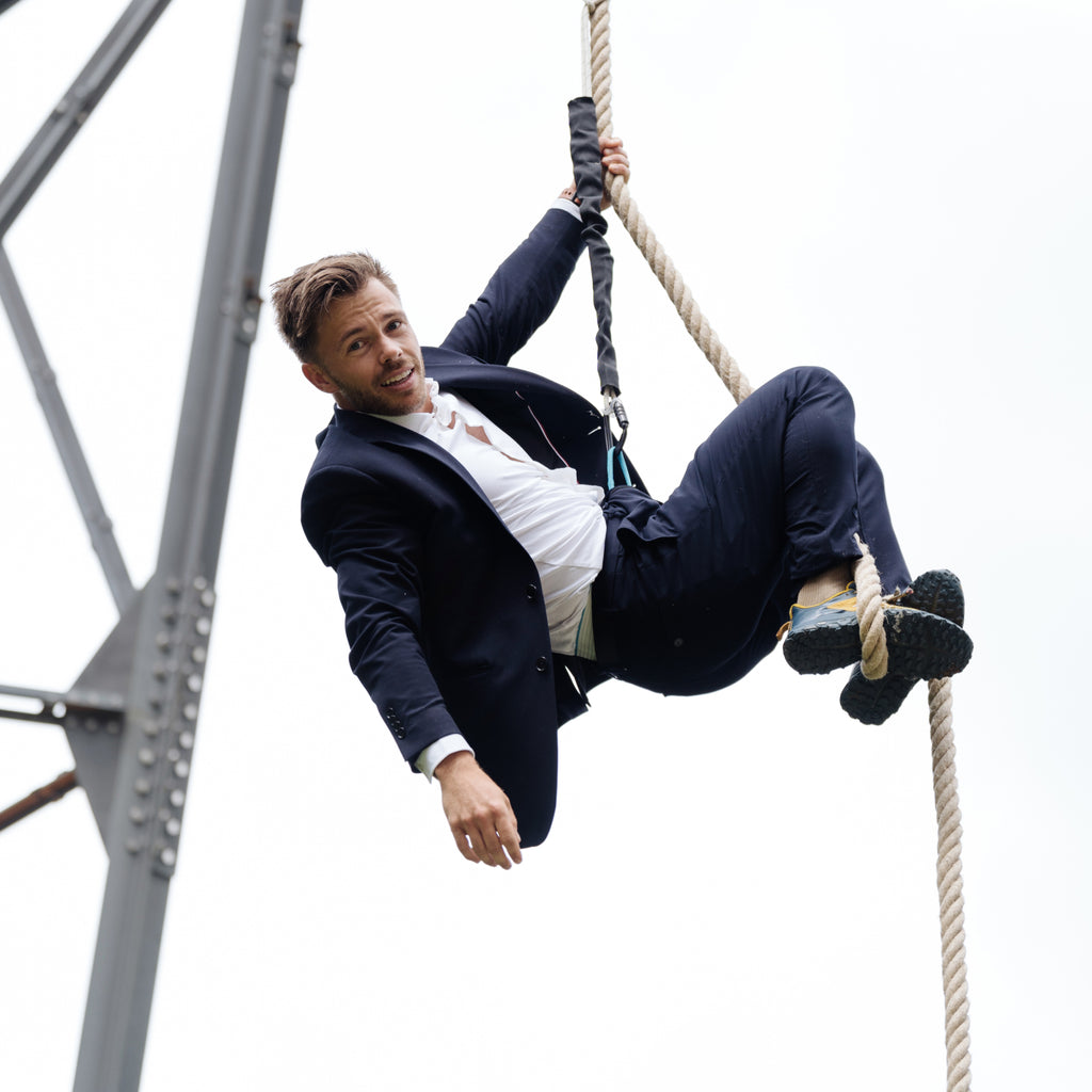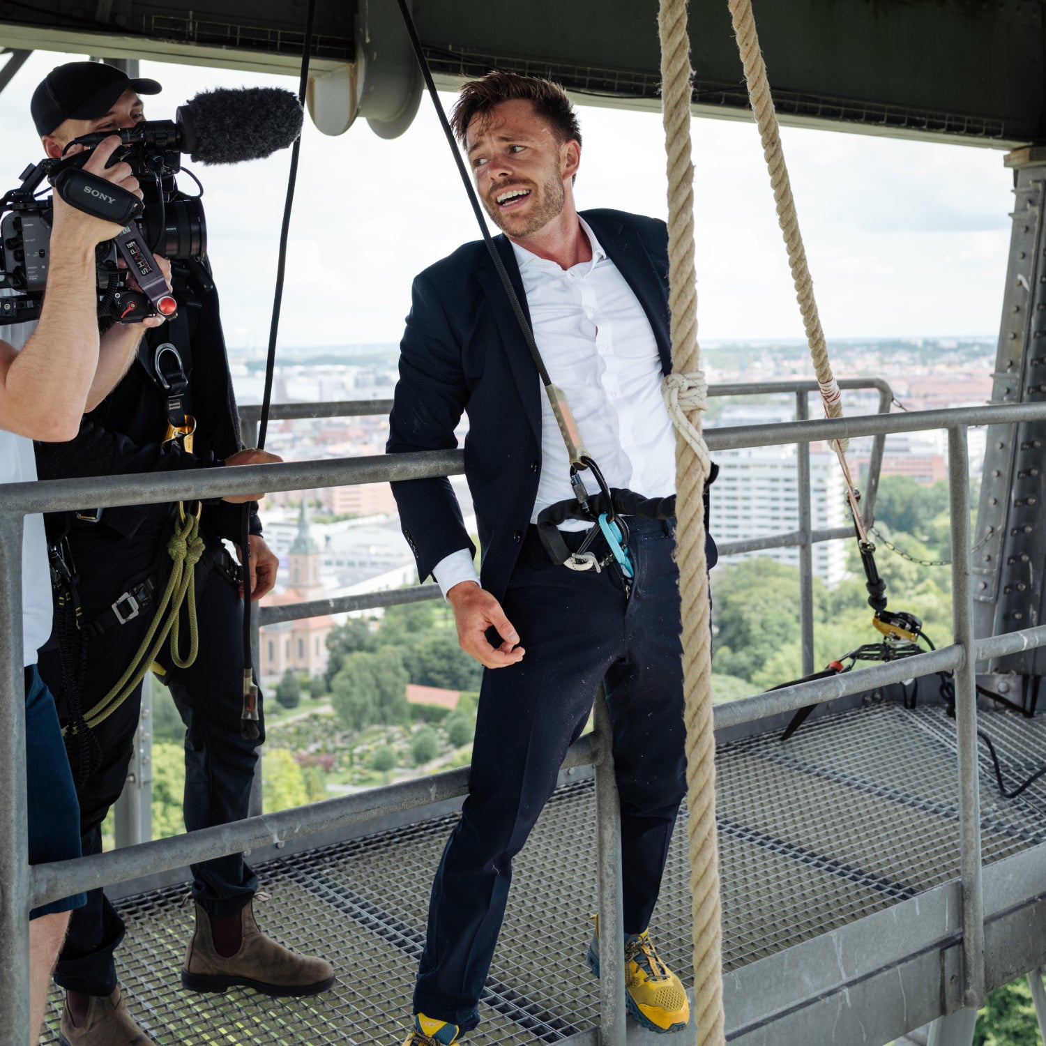Se Leon overvinne sin høydeskrekk og gjennomføre verdens lengste tauklatring i dress, og våg å utfordre deg selv.