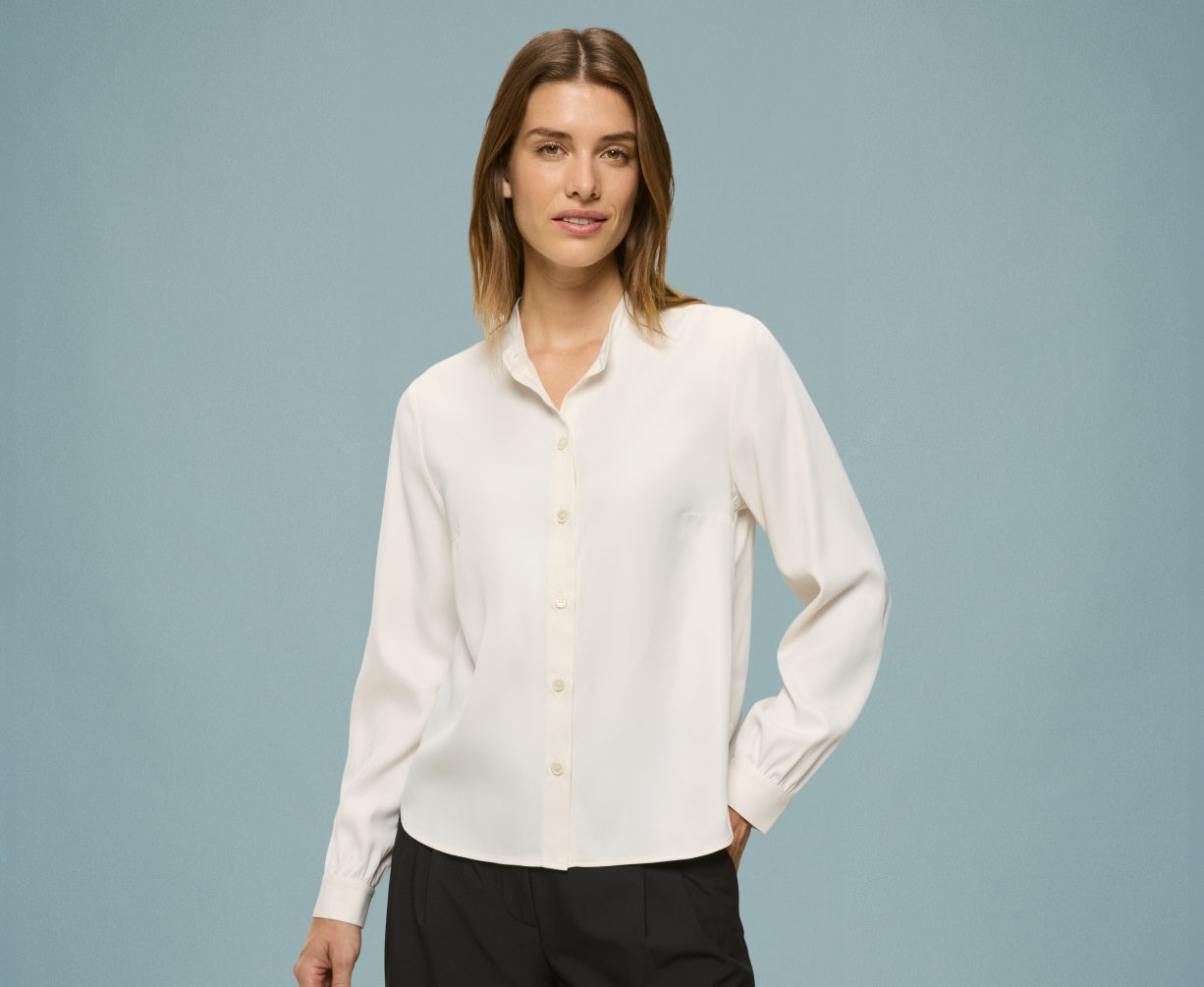 Luksuriøs myk følelse, elegant uttrykk: Møt vår Vienna Blouse. Denne blusen har en vakker, glatt overflate, og stoffet faller fint rundt kroppen. Vienna-blusen har kinakrage og lett puffede ermer som gir et feminint uttrykk og frisker enkelt opp antrekket ditt.