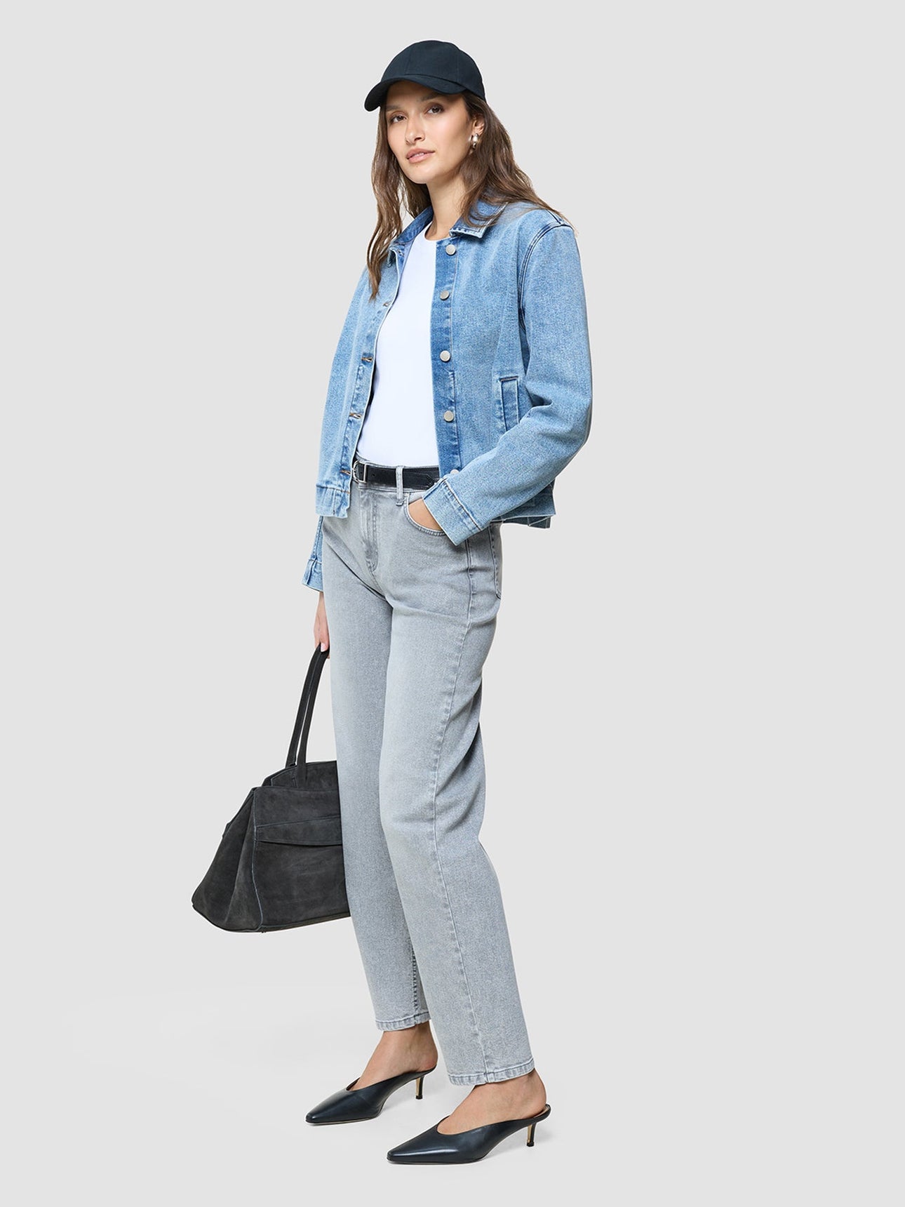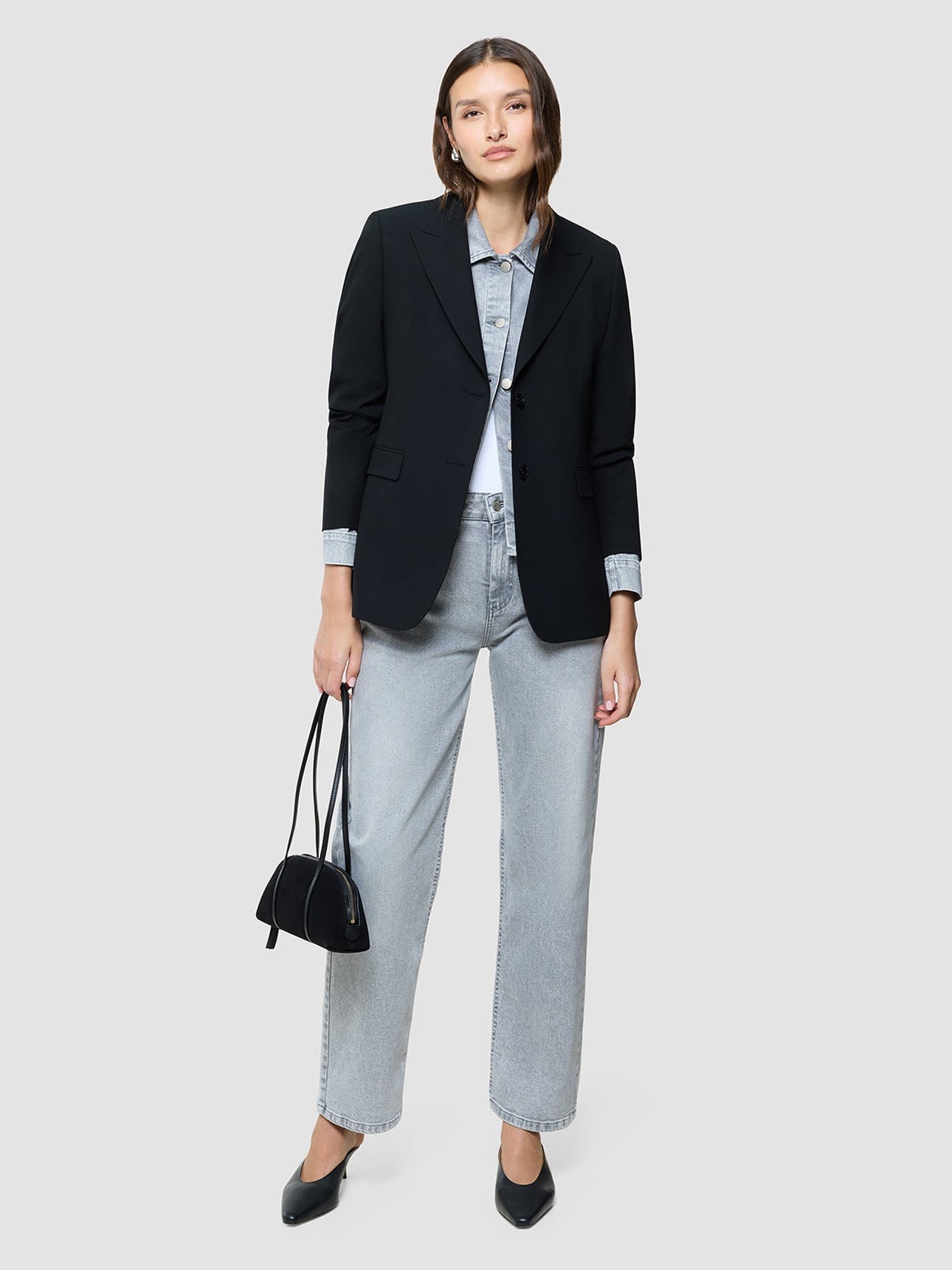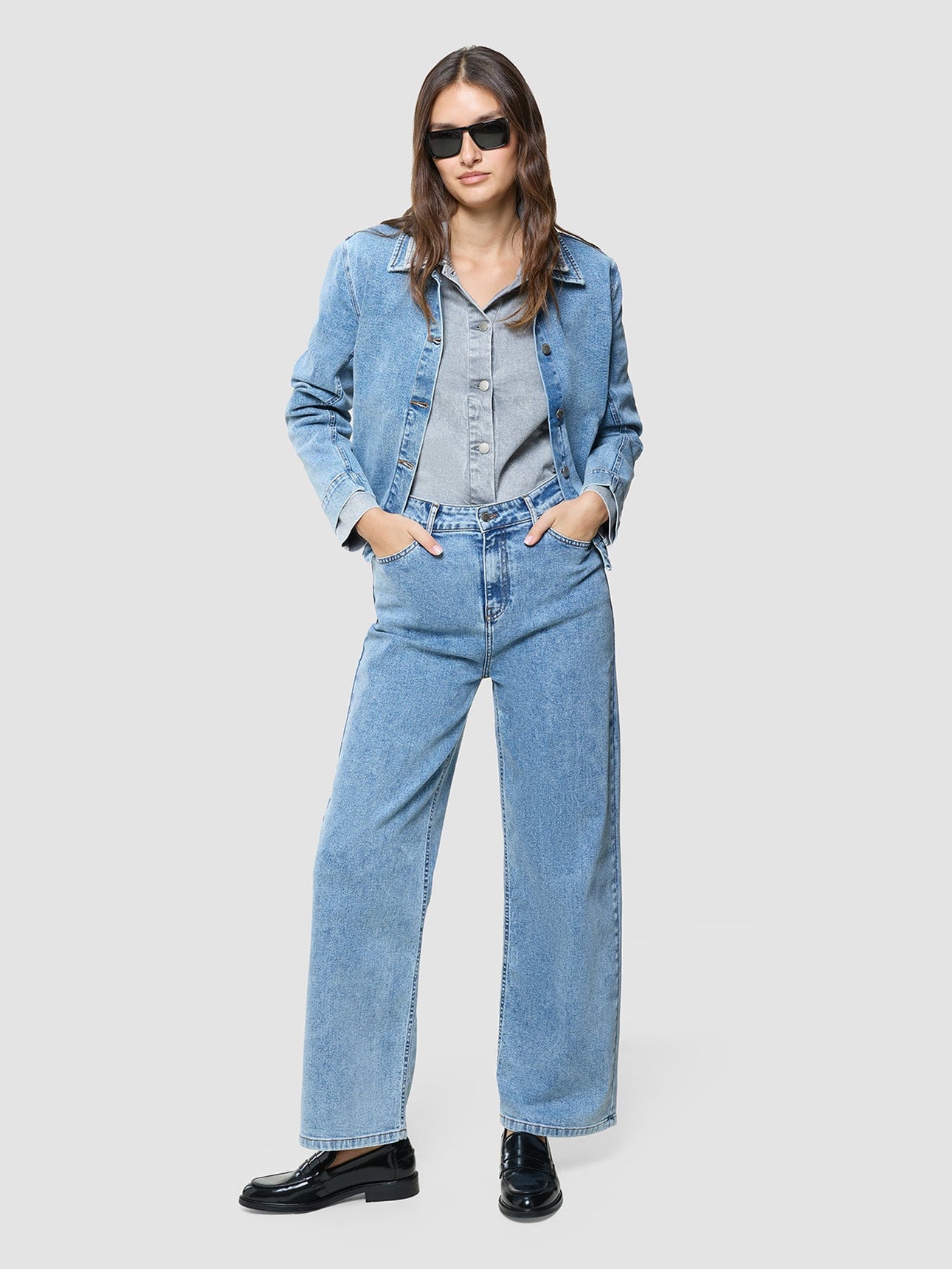Dette antrekket tar denim et steg videre med selvsikkerhet. Én denimjakke brukes som skjorte, lagvis under en oversized jakke: lagene føles gjennomtenkte, avslappede og lette. Kombinert med Classic Jeans i Light Grey Washed, får du et sterkt all-denim-antrekk som føles både moderne og helt naturlig.