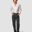 Denne kombinasjonen forener rene linjer med en casual holdning, og er ideell både til jobb og fritid. Den hvite skjorten tilfører et klassisk og raffinert preg, mens de mørke, rette jeansene gir en moderne og ubesværet vri.